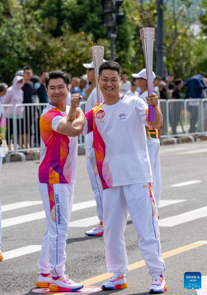 Torch bearers Hu Yuanyong (R) and Sheng Yijun pose during the torch relay of the 19th Asian Games in Zhoushan, east China's Zhejiang Province, Sept. 13, 2023. (Xinhua/Sun Fei)