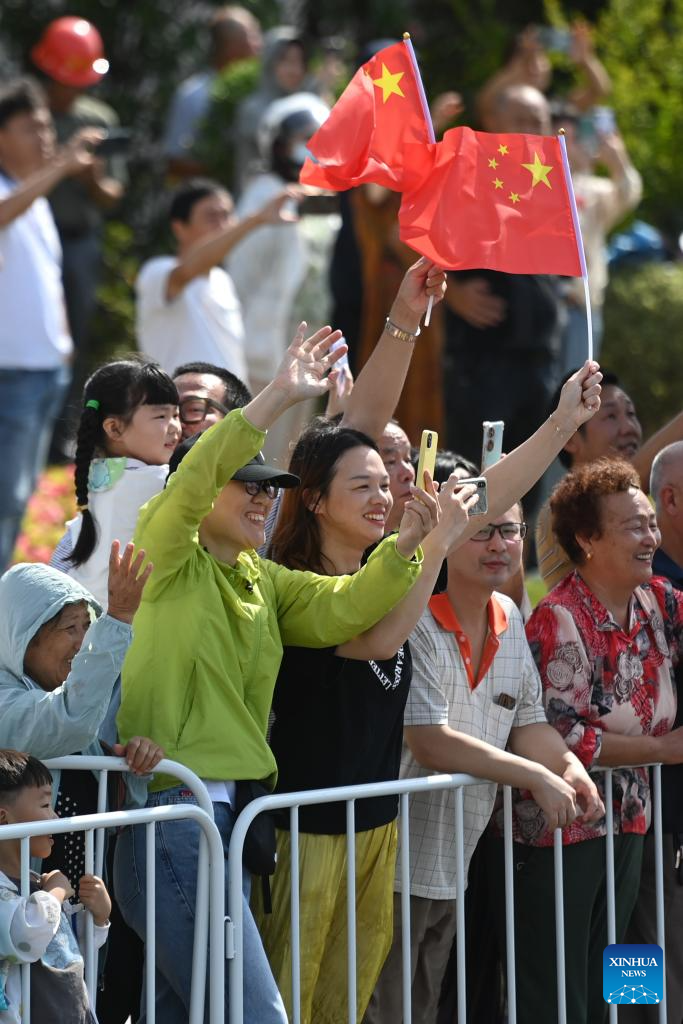 People watch the torch relay of the 19th Asian Games in Zhoushan, east China's Zhejiang Province, Sept. 13, 2023. (Xinhua/Huang Zongzhi)