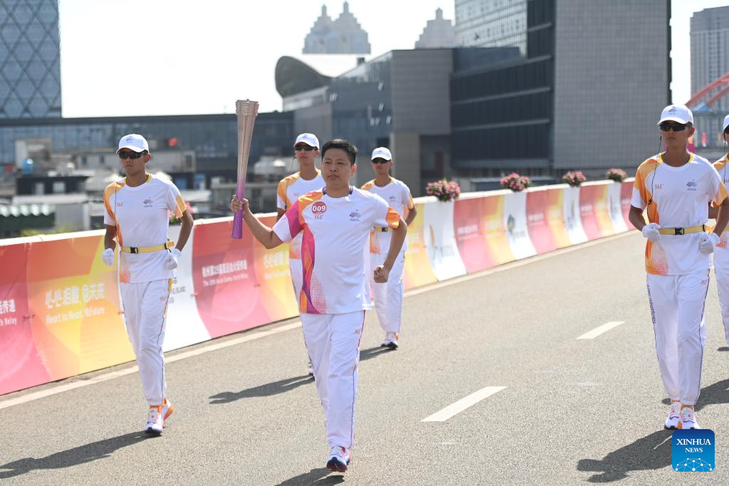 Torch bearer Luo Yu runs with the torch during the torch relay of the 19th Asian Games in Zhoushan, east China's Zhejiang Province, Sept. 13, 2023. (Xinhua/Huang Zongzhi)