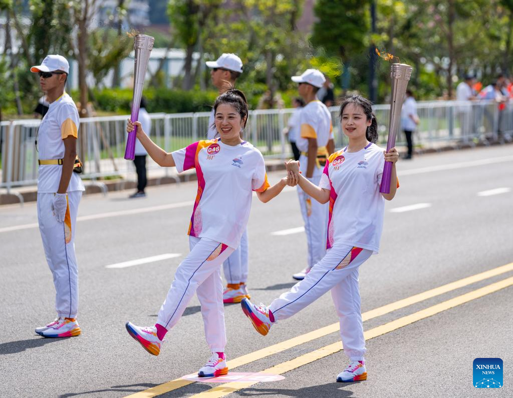 Torch bearers Yang Jiayu (R) and Wang Lin pose during the torch relay of the 19th Asian Games in Zhoushan, east China's Zhejiang Province, Sept. 13, 2023. (Xinhua/Huang Zongzhi)