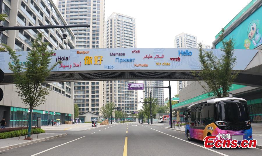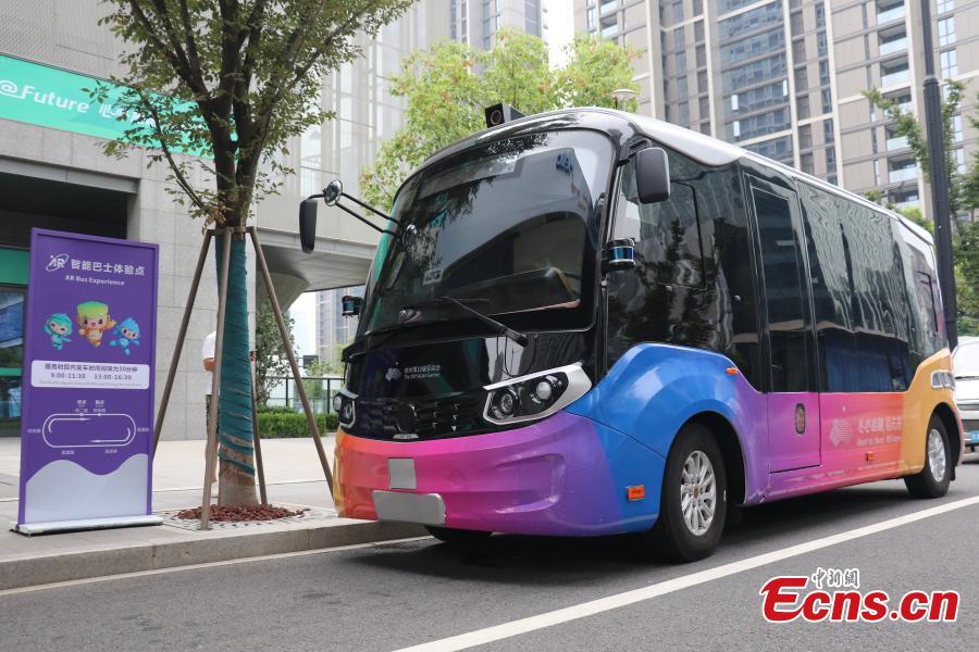 An autonomous driving shuttle bus parks at the 19th Asian Games Village in Hangzhou, east China's Zhejiang Province, Sept. 12, 2023. (Photo: China News Service/Qian Chenfei)