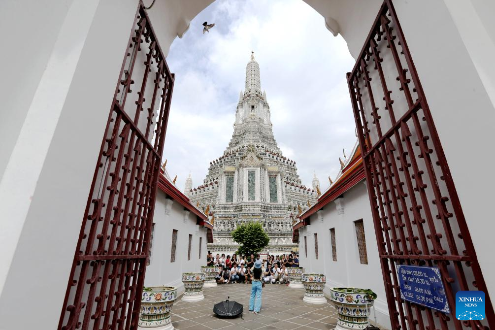 Tourists take photos at the Wat Arun in Bangkok, Thailand, June 16, 2023. (Xinhua/Wang Teng)