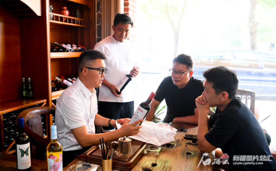 A photo shows Yi Xiaojun (first from left) introducing Georgian red wine to customers, Aug. 16, 2023. (Photo by Shiliuyun-Xinjiang Daily/ Chen Qiangwei)