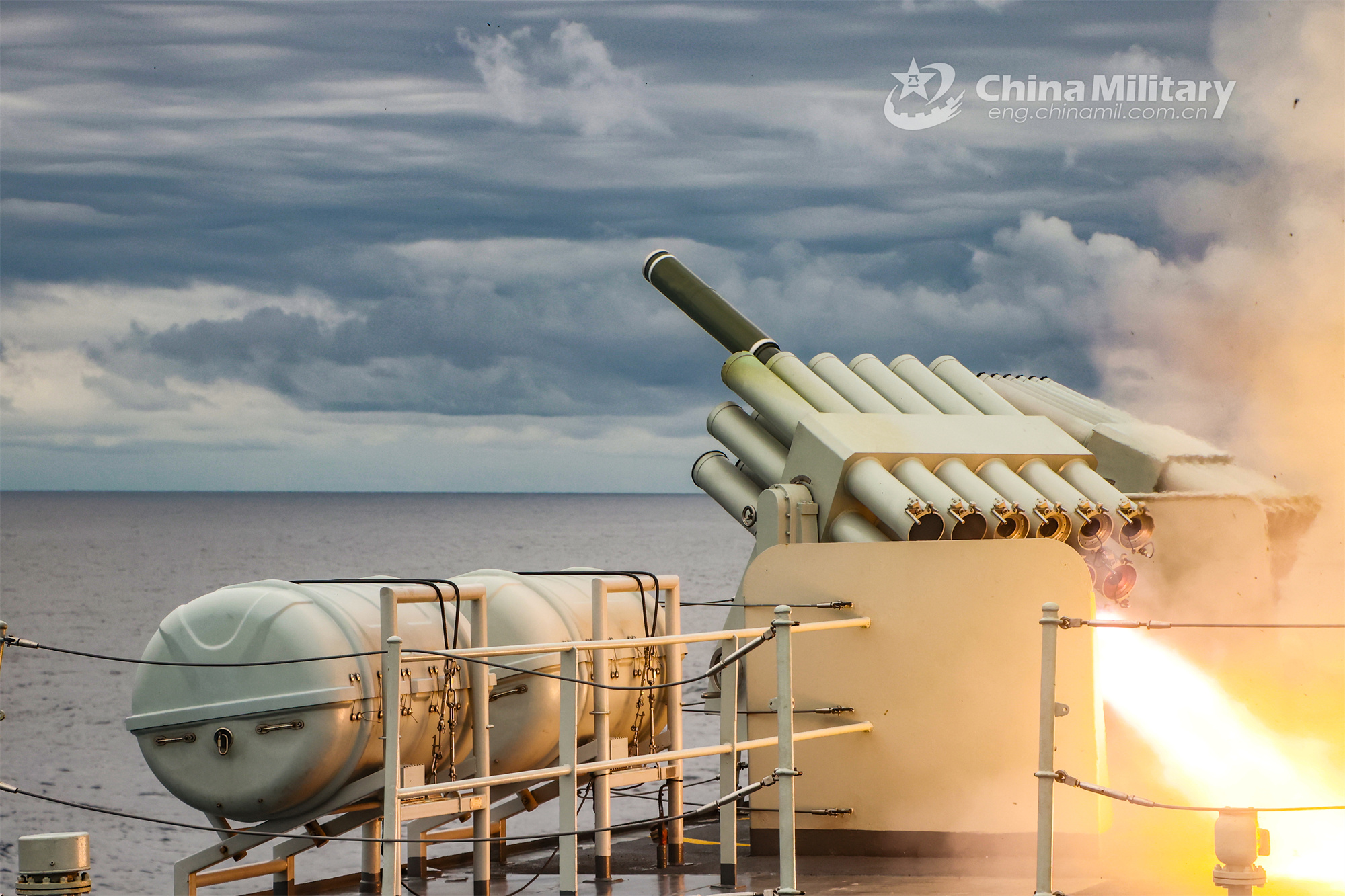 The guided-missile destroyer Hefei attached to a destroyer flotilla with the navy under the PLA Southern Theater Command fires a jamming shell during a coordinated offensive and defensive training drill in a real-combat environment. (eng.chinamil.com.cn/Photo by Yang Yunxiang)