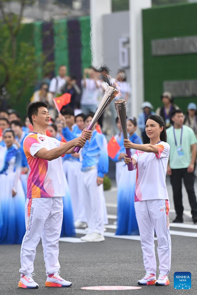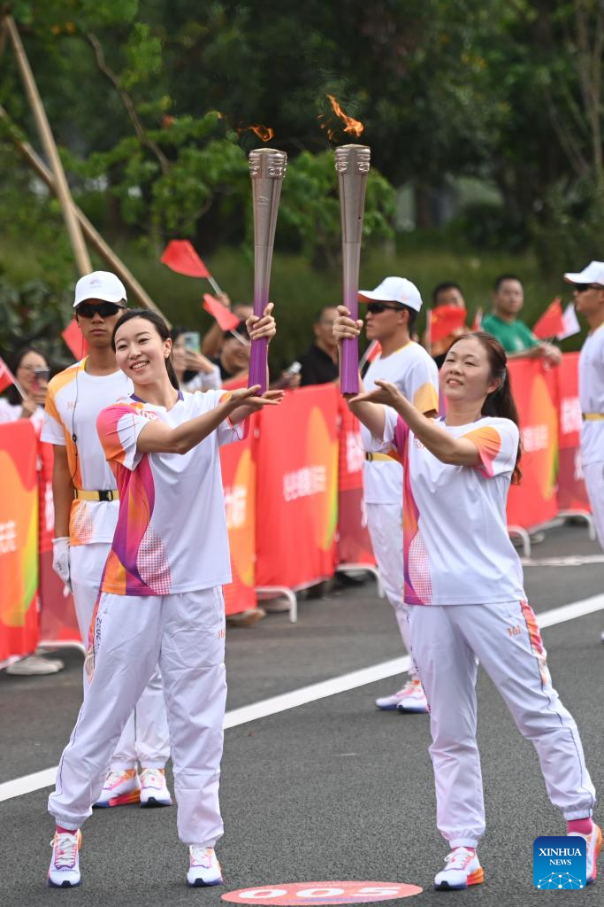 Torch bearers Wei Mengxi (R) and Lv Yicong pass the flame during the torch relay of the 19th Asian Games in Taizhou, east China's Zhejiang Province, Sept. 14, 2023. (Xinhua/Huang Zongzhi)