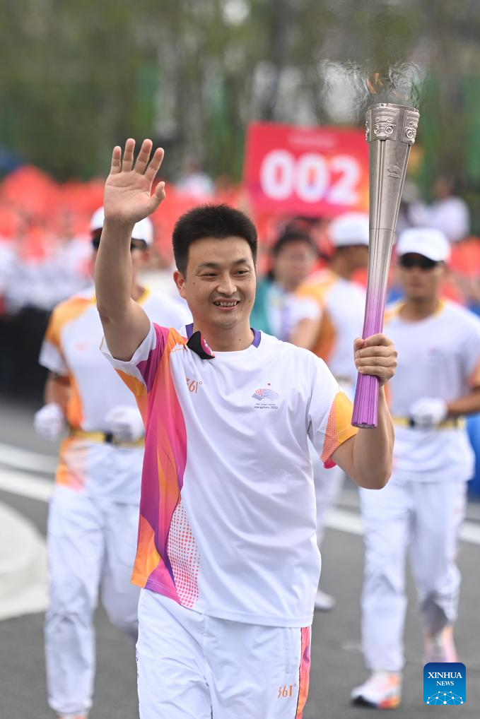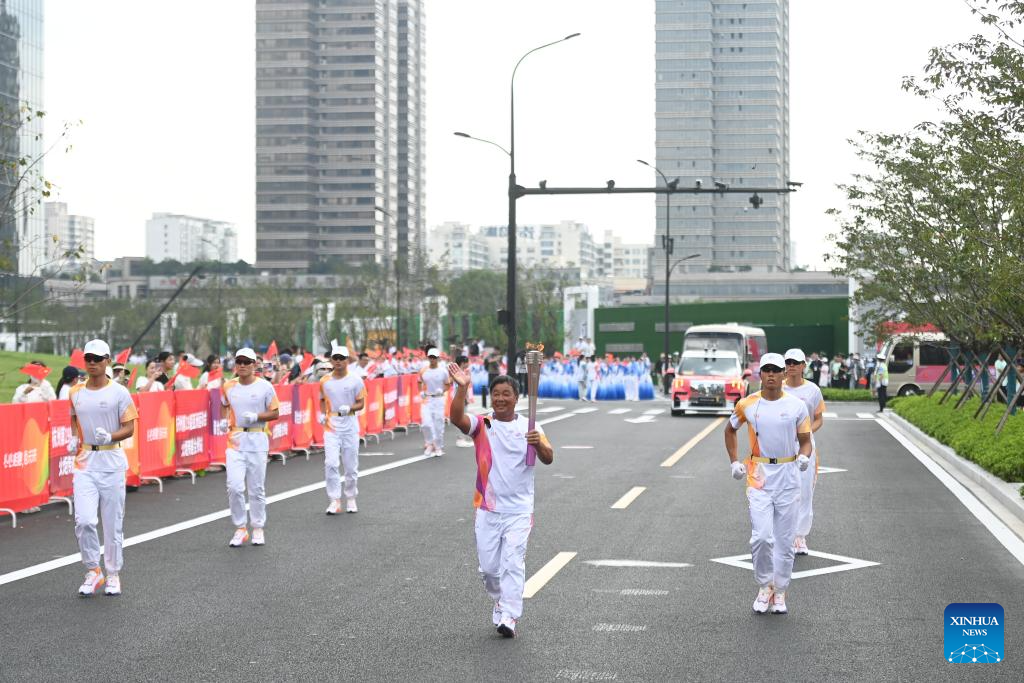 Torch bearer Ye Peng runs with the torch during the torch relay of the 19th Asian Games in Taizhou, east China's Zhejiang Province, Sept. 14, 2023. (Xinhua/Huang Zongzhi)