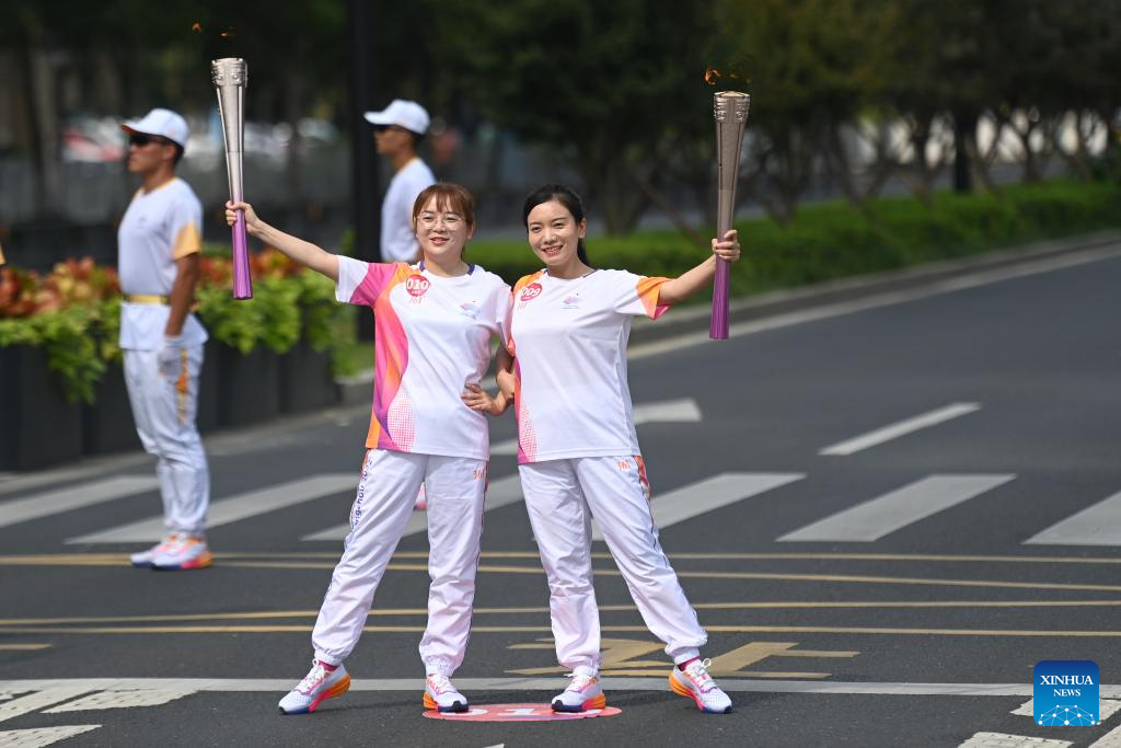 Torch bearers Ruan Lingfei (R) and Feng Yu pose during the torch relay of the 19th Asian Games in Taizhou, east China's Zhejiang Province, Sept. 14, 2023. (Xinhua/Huang Zongzhi)