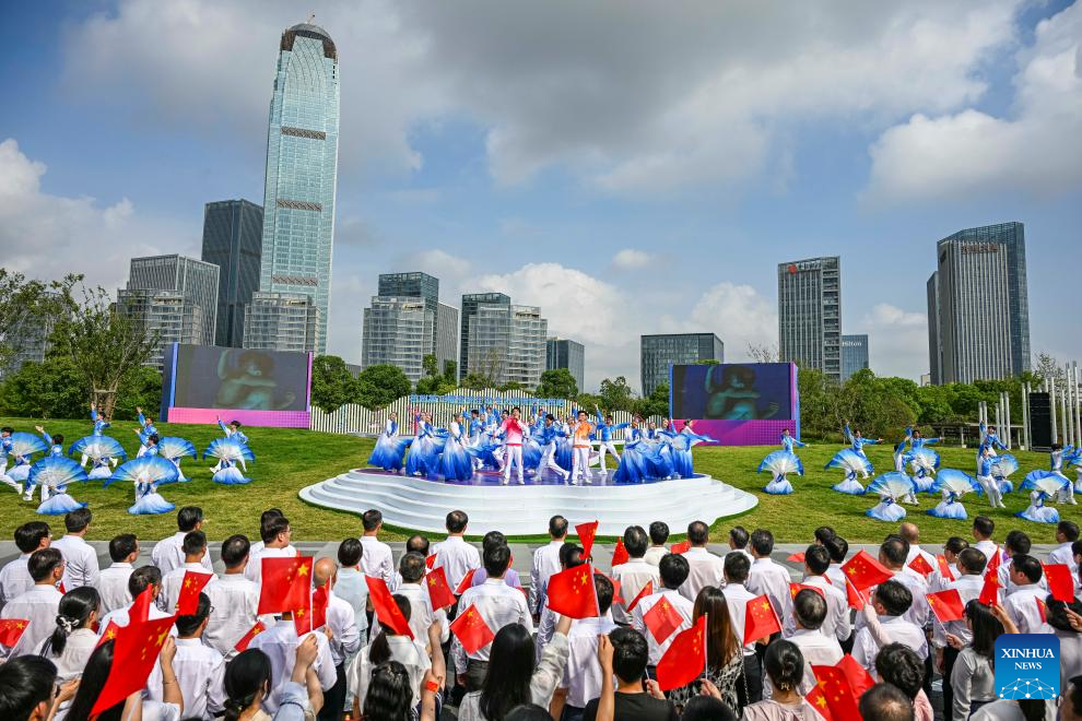 Photo taken on Sept. 14, 2023 shows the beginning ceremony during the torch relay of the 19th Asian Games in Taizhou, east China's Zhejiang Province, Sept. 14, 2023. (Xinhua/Sun Fei)