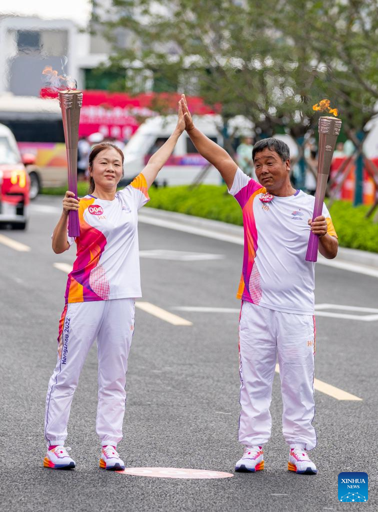 Torch bearers Feng Yu (Bottom) and Huang Junmin pose during the torch relay of the 19th Asian Games in Taizhou, east China's Zhejiang Province, Sept. 14, 2023. (Xinhua/Huang Zongzhi)