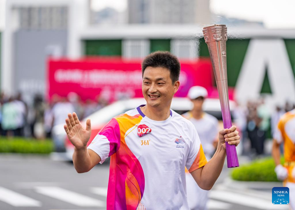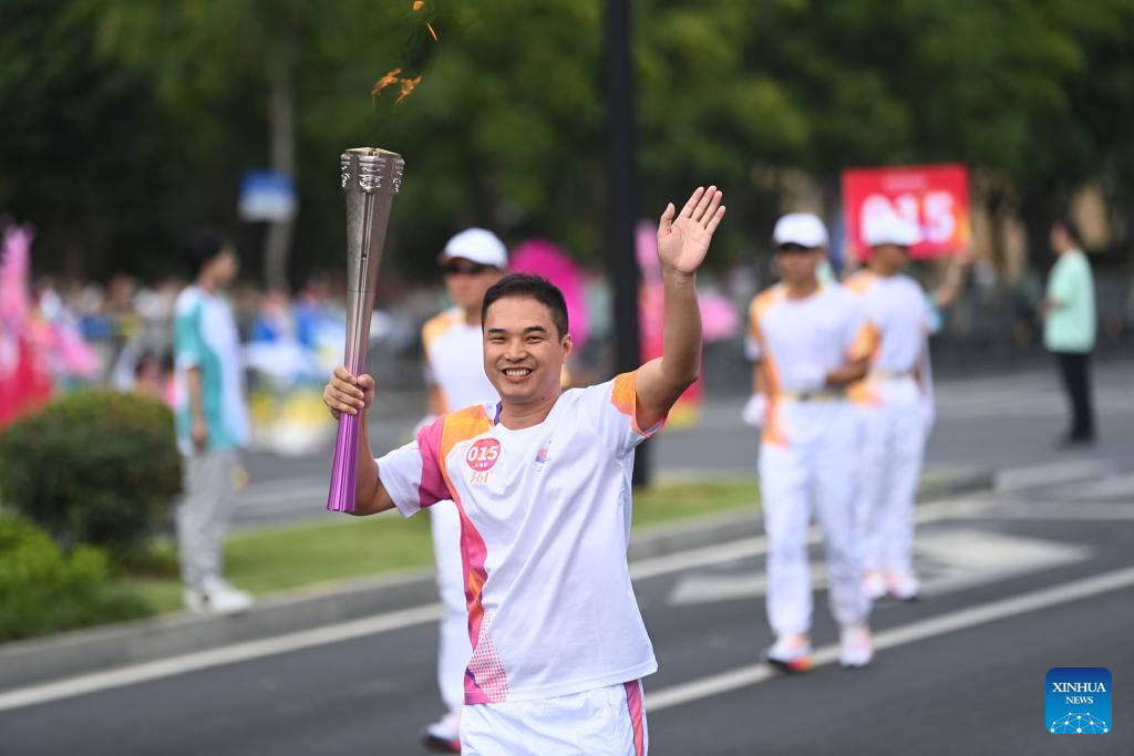 Torch bearer Lu Jingliang runs with the torch during the torch relay of the 19th Asian Games in Taizhou, east China's Zhejiang Province, Sept. 14, 2023. (Xinhua/Huang Zongzhi)