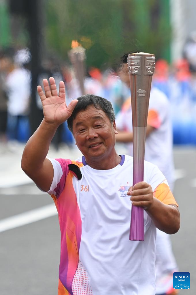 Torch bearer Fan Yongsheng runs with the torch during the torch relay of the 19th Asian Games in Taizhou, east China's Zhejiang Province, Sept. 14, 2023. (Xinhua/Huang Zongzhi)