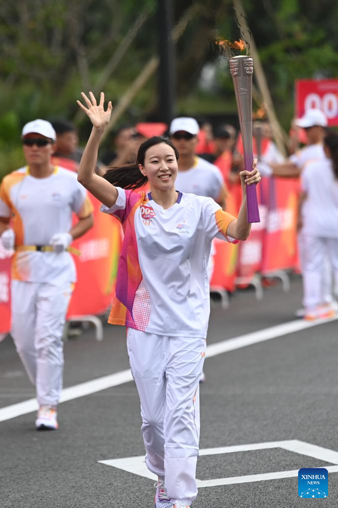 Torch bearer Yang Wenjie runs with the torch during the torch relay of the 19th Asian Games in Taizhou, east China's Zhejiang Province, Sept. 14, 2023. (Xinhua/Huang Zongzhi)