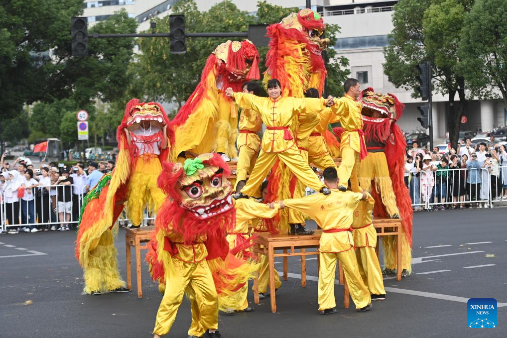 Lion dancers perform during the torch relay of the 19th Asian Games in Taizhou, east China's Zhejiang Province, Sept. 14, 2023. (Xinhua/Huang Zongzhi)