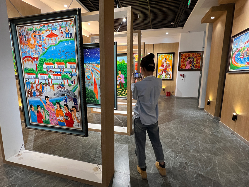 A visitor takes pictures of Daolang-style paintings created by farmers in northwest China's Xinjiang Uygur Autonomous Region at an exhibition hall. (People's Daily Online/Chang Xuemei)