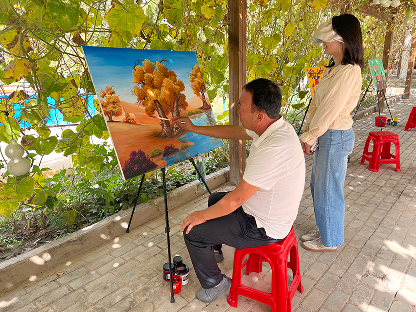 Kumkusar township has long been known for its Daolang-style paintings, which feature bright colors, exaggerated shapes, rich symbolism, and a strong artistic appeal. Painters of Daolang-style paintings gain endless inspiration from scenes and experiences in their daily life, such as deserts, poplar trees, farming activities, and gatherings.
