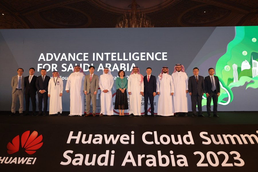 People attend the Huawei Cloud Summit Saudi Arabia 2023 in Riyadh, Saudi Arabia, on Sept. 4, 2023. The Chinese tech giant Huawei announced on Monday the opening of a cloud data center in Riyadh, as part of its efforts to expand its online service offerings in the Middle East. (Xinhua/Wang Haizhou)