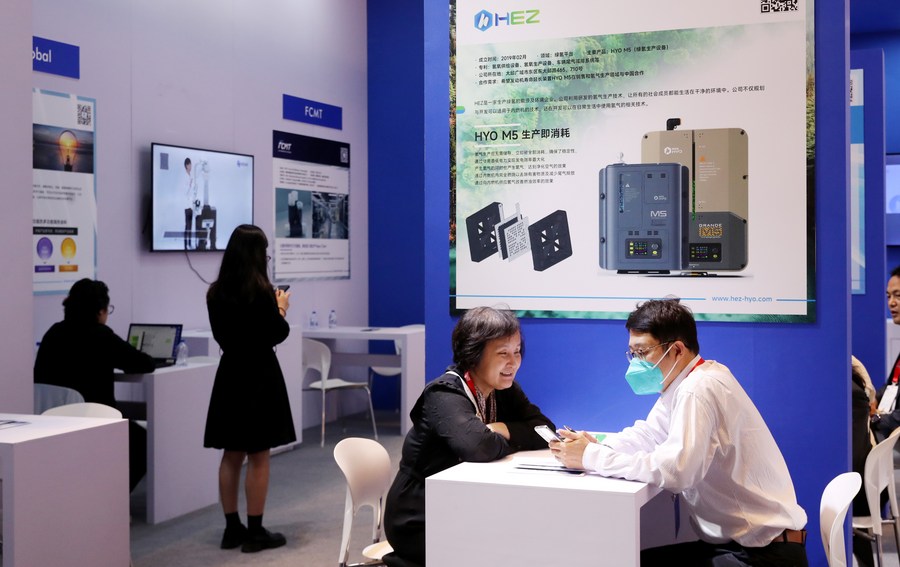 A staff member introduces products to a visitor at the InnoMatch Global Tech-Matching Fair of the 2023 Pujiang Innovation Forum in east China's Shanghai Sept. 10, 2023. A global technology matching platform associated to the 2023 Pujiang Innovation Forum in Shanghai has offered 25 billion yuan (about 3.5 billion U.S. dollars) worth of innovation matching projects. (Xinhua/Fang Zhe)