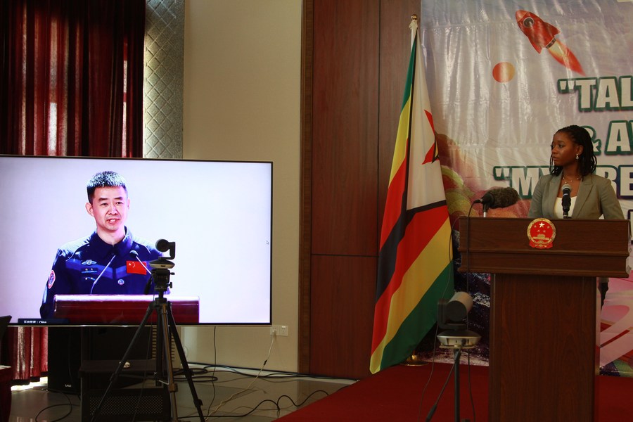 Nicole Njanjari, a participant of the "My Dream" painting competition for African youth, listens while a Chinese astronaut responds to her question during an awarding ceremony of the competition in Harare, Zimbabwe, Sept. 13, 2023. (Photo by Tafara Mugwara/Xinhua)