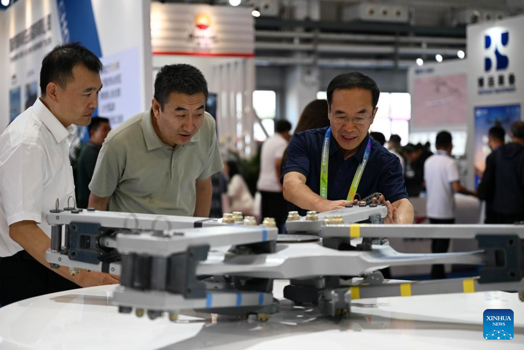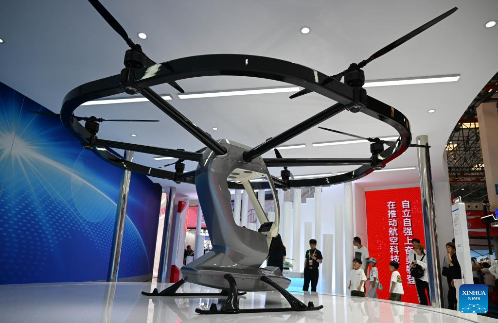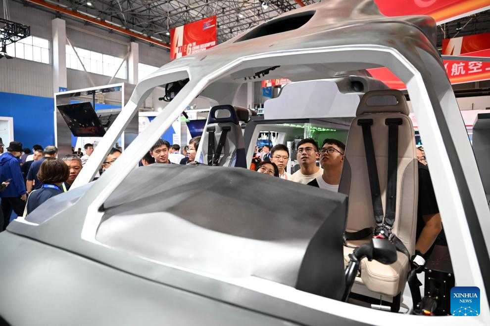 People view an AR-300 aerial vehicle at the 6th China Helicopter Exposition in north China's Tianjin Municipality, Sept. 14, 2023. (Xinhua/Zhao Zishuo)