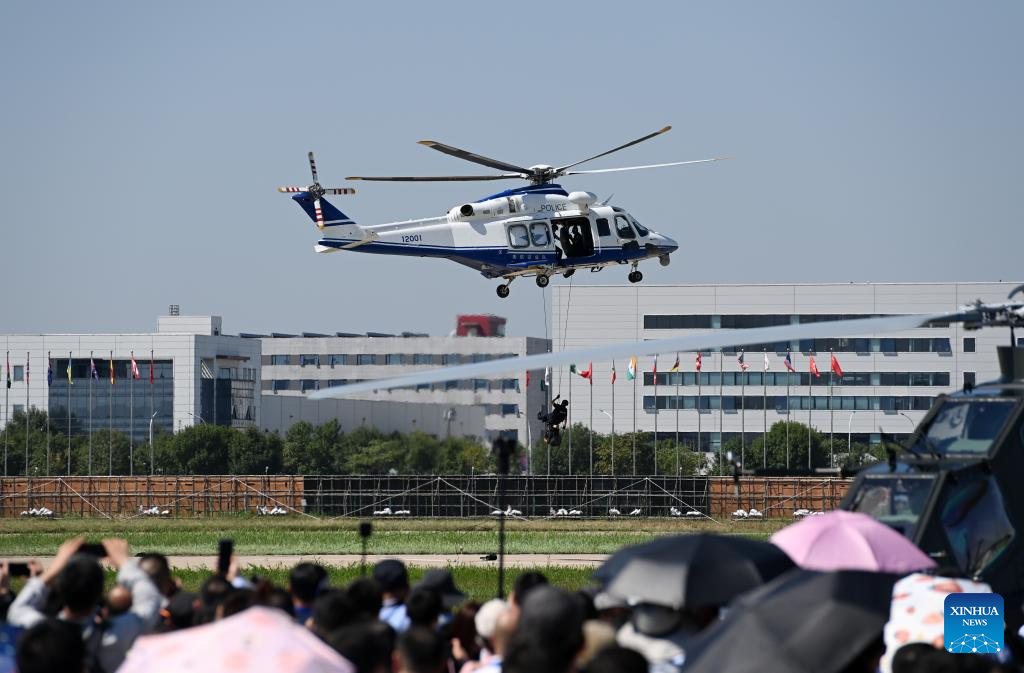 A helicopter of Tianjin Municipal Public Security Bureau performs during the opening ceremony of the 6th China Helicopter Exposition in north China's Tianjin Municipality, Sept. 14, 2023. (Xinhua/Zhao Zishuo)