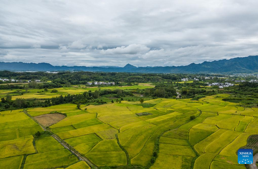 This aerial photo taken on Sept. 13, 2023 shows paddy fields in Yixian County, Huangshan City of east China's Anhui Province. (Xinhua/Guo Chen)