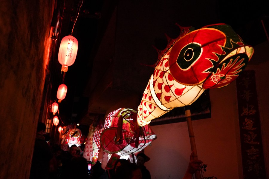 People holding fish-shaped lanterns parade during the Chinese New Year celebrations in Shexian County of Huangshan City, east China's Anhui Province, Jan. 31, 2023. (Xinhua/Du Yu)