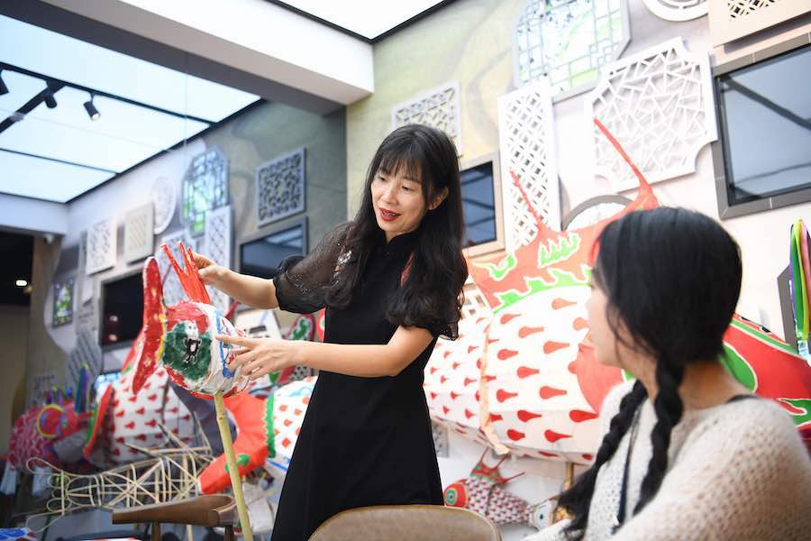 Pan Min (L), who is in charge of an intangible cultural heritage exhibition hall, gives instructions on making fish-shaped lanterns in Shexian County, east China's Anhui Province, Sept. 5, 2023. (Xinhua/Zhang Duan)