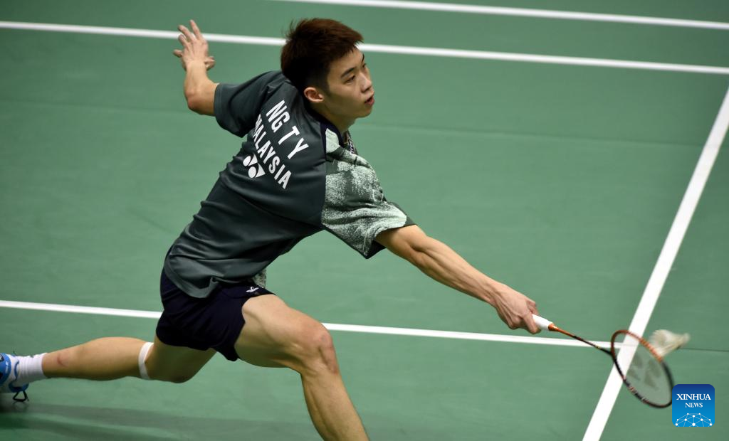 Ng Tze Yong of Malaysia hits a return to Tsuneyama Kanta of Japan during the men's singles second round match at Hong Kong Open 2023 badminton tournament in south China's Hong Kong, Sept. 14, 2023. (Xinhua/Lo Ping Fai)