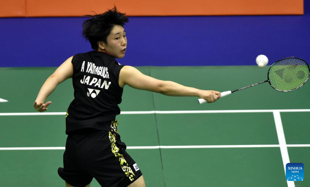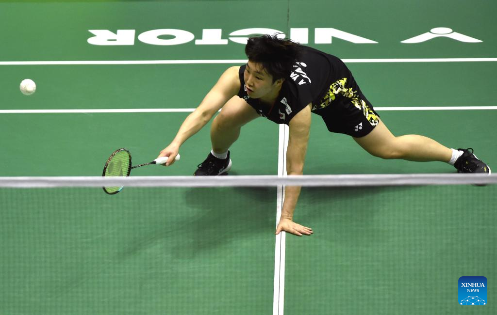 Yamaguchi Akane of Japan hits a return to Kirsty Gilmour of Scotland during the women's singles second round match at Hong Kong Open 2023 badminton tournament in south China's Hong Kong, Sept. 14, 2023. (Xinhua/Lo Ping Fai)