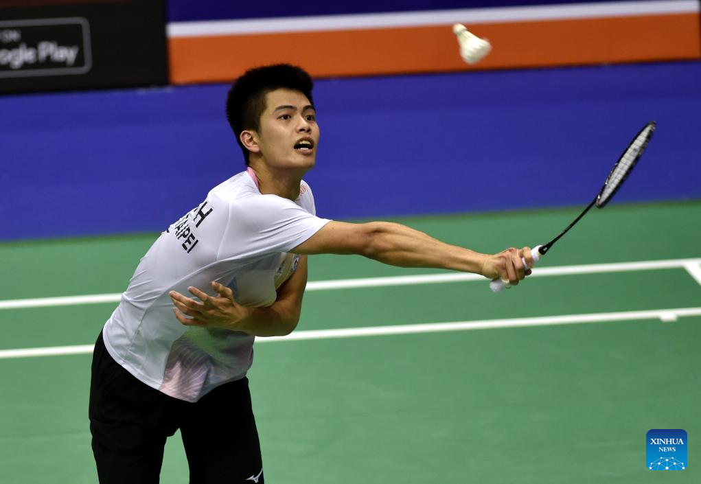 Lee Chia Hao of Chinese Taipei hits a return to Lee Zii Jia of Malaysia during the men's singles second round match at Hong Kong Open 2023 badminton tournament in south China's Hong Kong, Sept. 14, 2023. (Xinhua/Lo Ping Fai)