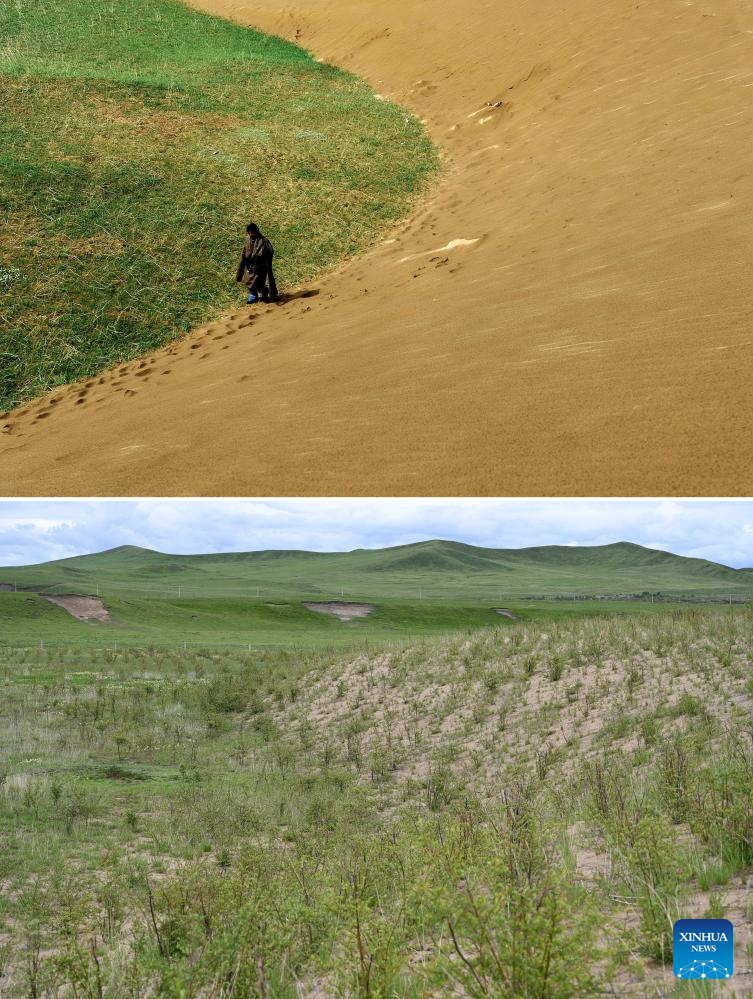 This combo photo shows a villager walking on a degraded grassland (above, photo taken by Xinhua photographer Nie Jianjiang on June 9, 2011) and the grassland after restoration (below, photo taken by Xinhua photographer Chen Bin on July 6, 2023) in Ouqiang Village of Maqu County, Gannan Tibetan Autonomous Prefecture, northwest China's Gansu Province.