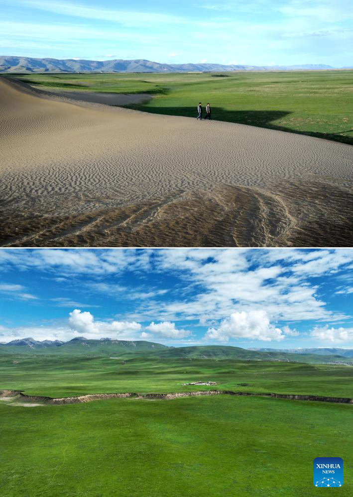 This combo photo shows technicians checking the grass degradation of a grassland (above, photo taken by Xinhua photographer Nie Jianjiang on June 9, 2011) and the grassland after restoration (below, photo taken by Xinhua photographer Chen Bin on July 6, 2023) in Ouqiang Village of Maqu County, Gannan Tibetan Autonomous Prefecture, northwest China's Gansu Province.