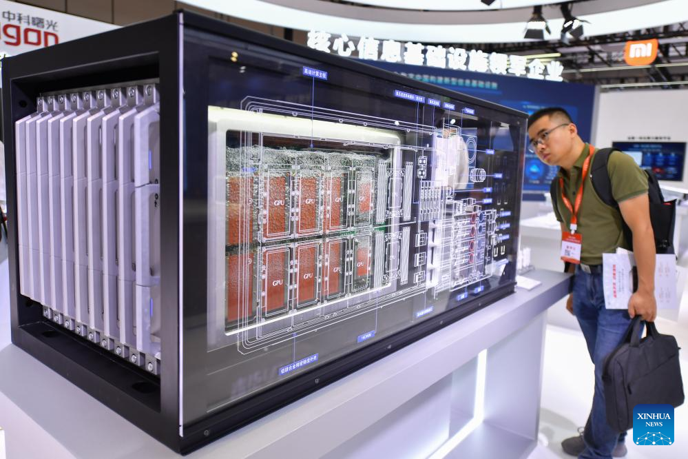 A visitor learns about a computer, applied with immersion phase change liquid cooling technology, during the 2023 World Computing Conference in Changsha, central China's Hunan Province, Sept. 15, 2023.