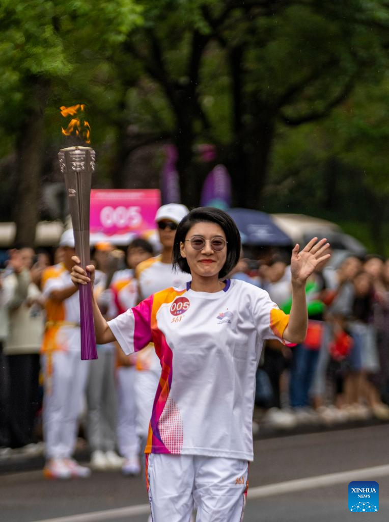 Torch bearer Zhu Xueying runs with the torch during the torch relay of the 19th Asian Games in Lishui, east China's Zhejiang Province, Sept. 16, 2023. (Xinhua/Sun Fei)