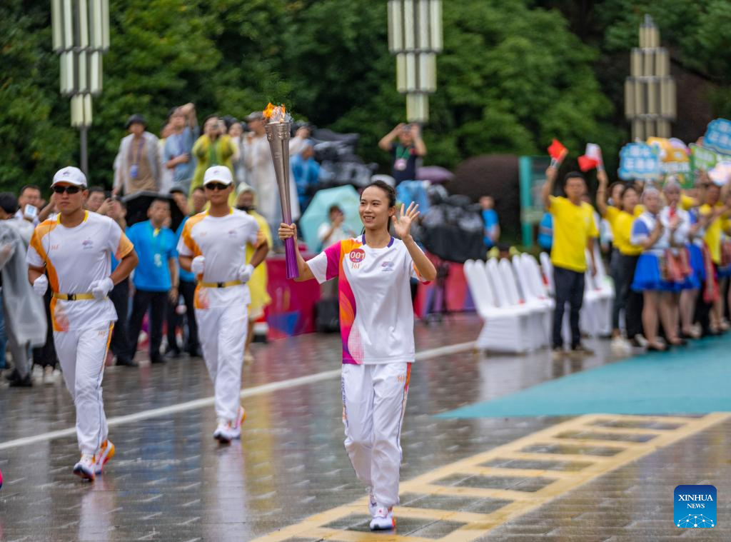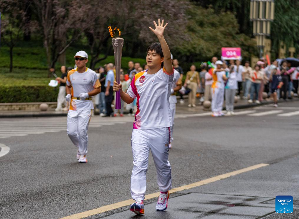 Torch bearer Peng Yunfei runs with the torch during the torch relay of the 19th Asian Games in Lishui, east China's Zhejiang Province, Sept. 16, 2023. (Xinhua/Sun Fei)