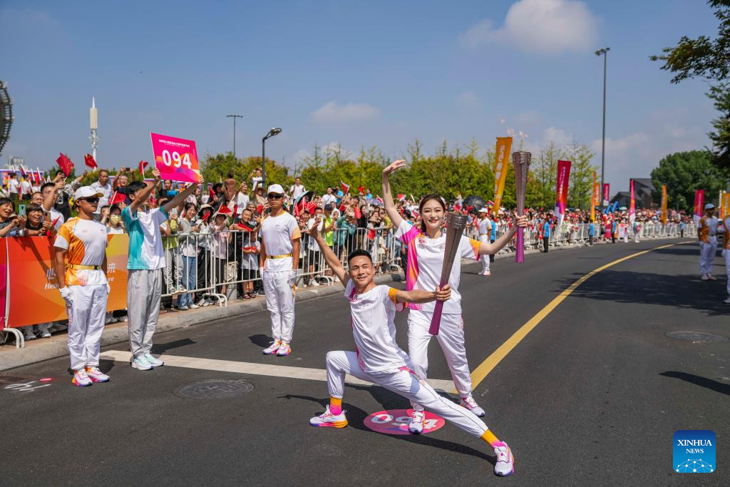 Torch bearers Gu Hailong (R) and Jin Ze during the torch relay of the 19th Asian Games in Jinhua, east China's Zhejiang Province, Sept. 17, 2023. (Xinhua/Sun Fei)