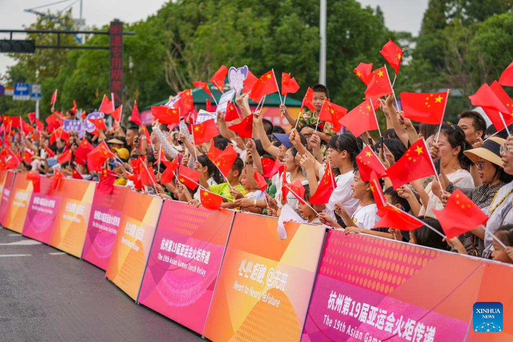 People watch the torch relay of the 19th Asian Games in Jinhua, east China's Zhejiang Province, Sept. 17, 2023. (Xinhua/Sun Fei)