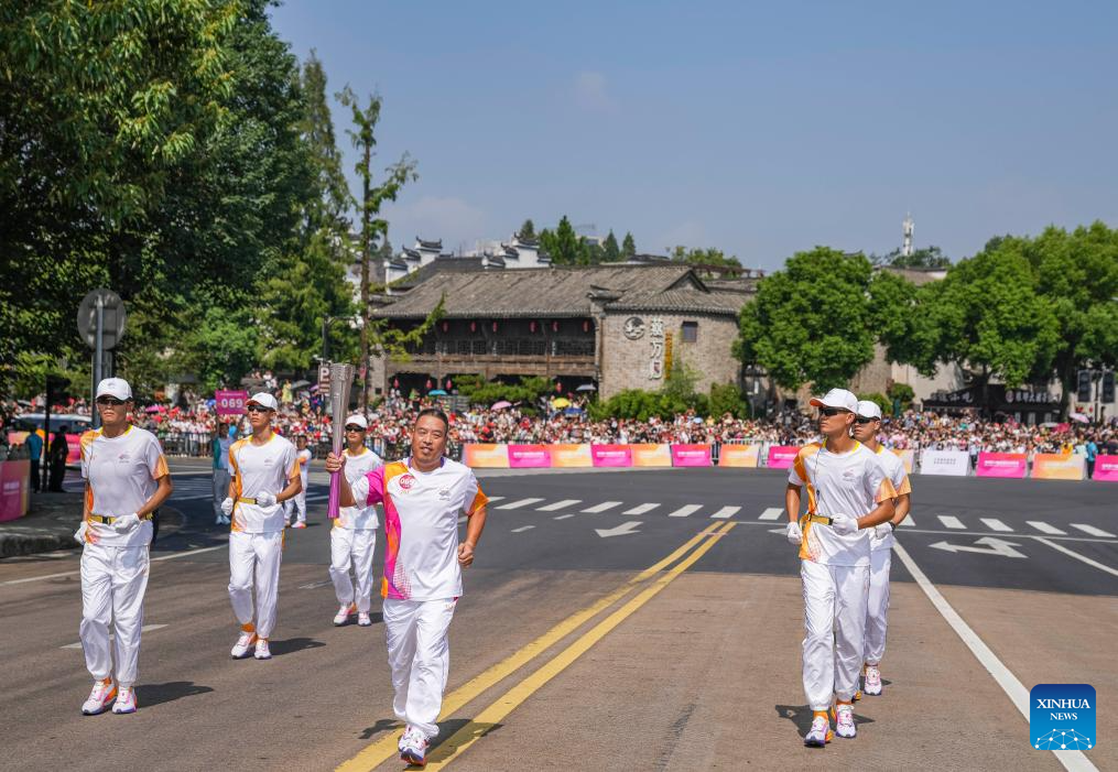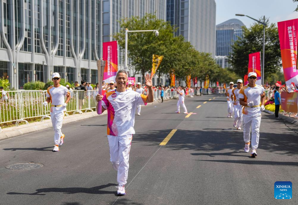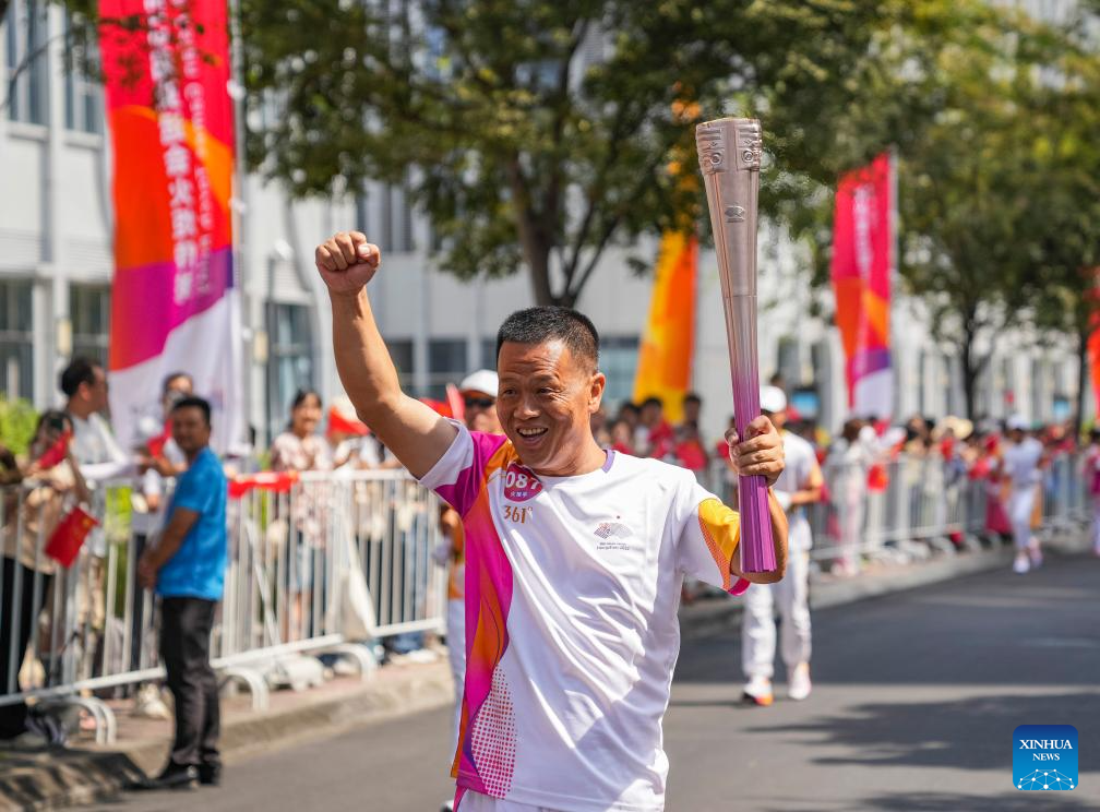 Torch bearer Lou Renbin runs with the torch during the torch relay of the 19th Asian Games in Jinhua, east China's Zhejiang Province, Sept. 17, 2023. (Xinhua/Sun Fei)