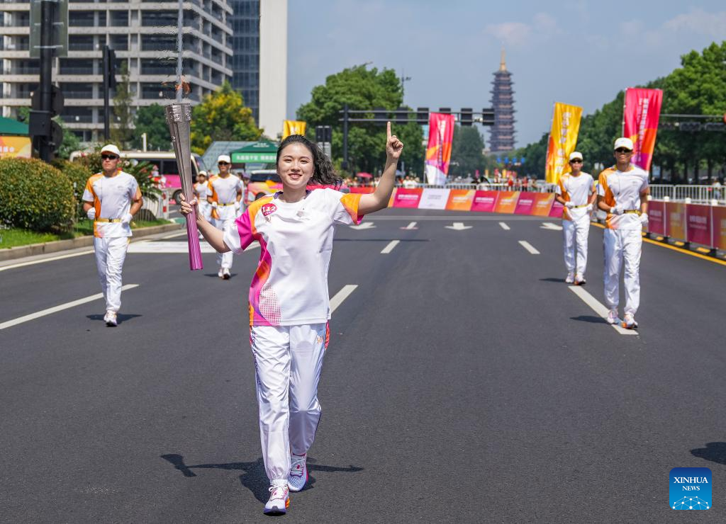 Torch bearer Cheng Ying runs with the torch during the torch relay of the 19th Asian Games in Jinhua, east China's Zhejiang Province, Sept. 17, 2023. (Xinhua/Sun Fei)