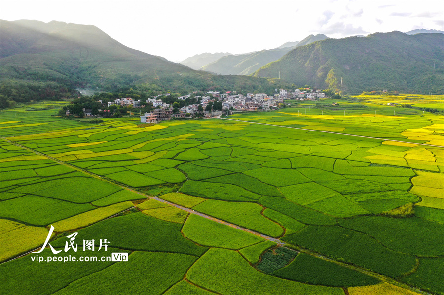 Photo shows rice fields and dwellings nearby in Liufeng townsip, Guiyang county, Chenzhou city, central China's Hunan Province. (vip.people.com.cn/ Zhou Xiuyuchun)