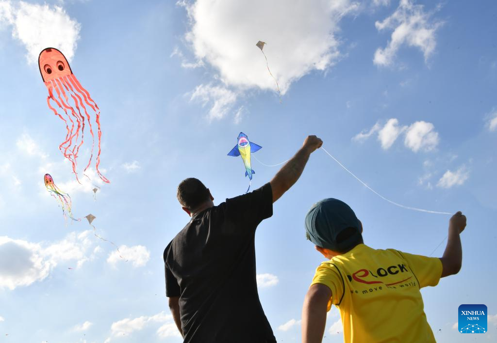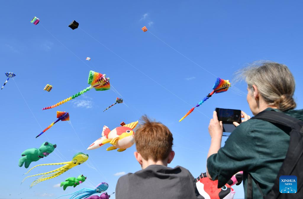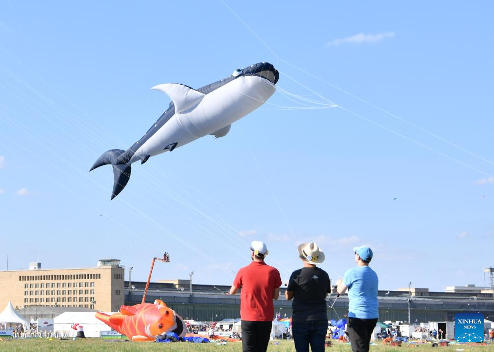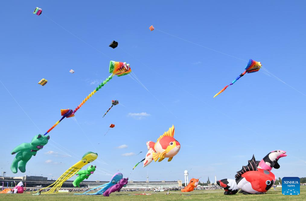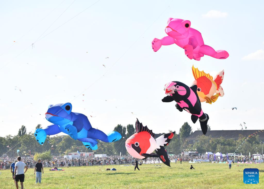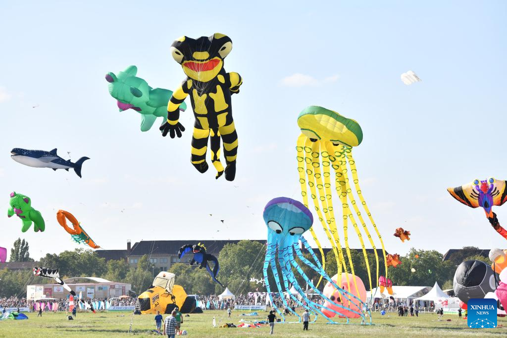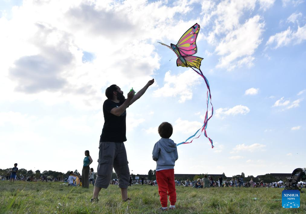 People fly kites during the Giant Kite Festival in Berlin, Germany, Sept. 16, 2023. (Xinhua/Ren Pengfei)