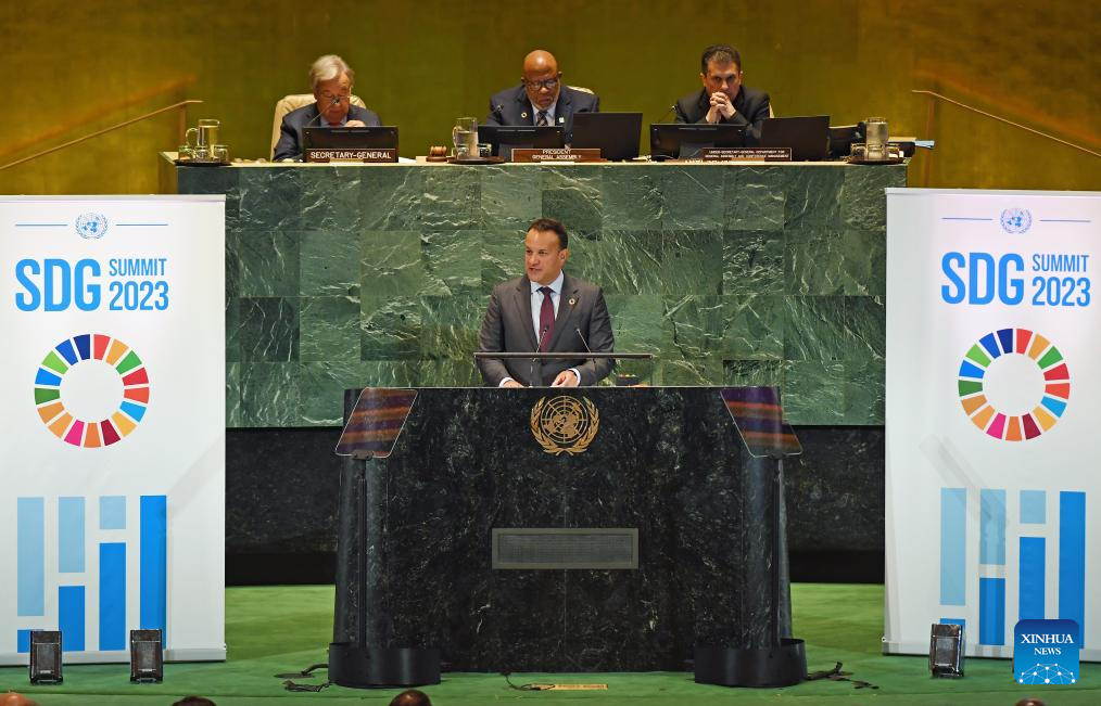 Irish Prime Minister Leo Varadkar (Front) speaks during the Sustainable Development Goals Summit at the UN headquarters in New York, on Sept. 18, 2023. World leaders on Monday reaffirmed their commitment to the Sustainable Development Goals (SDGs) at the SDG summit, which is being held on the sidelines of this year's general debate of the General Assembly. In a political declaration adopted at the summit, the leaders reaffirmed their commitment to "effectively implement the 2030 Agenda and its SDGs and uphold all principles enshrined in it." (Xinhua/Li Rui)