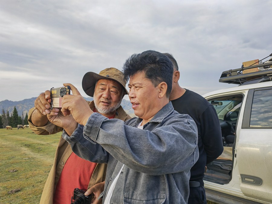 This photo taken on Aug. 11, 2023 with a mobile phone shows Tan Chengjun (L), a member of the Photojournalist Society of China, teaching herdsmen to take photos with a mobile phone in the pastoral area of Solbastao in northwest China's Xinjiang Uygur Autonomous Region. (Xinhua/Hu Huhu)