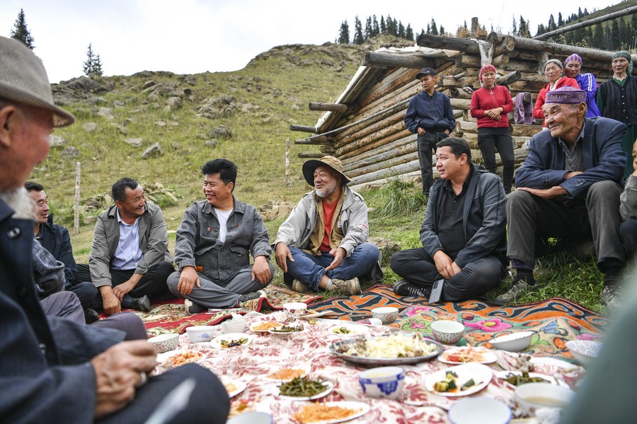 Tan Chengjun (C), a member of the Photojournalist Society of China, talks with herdsmen in the pastoral area of Solbastao in northwest China's Xinjiang Uygur Autonomous Region, Aug. 12, 2023. (Xinhua/Hu Huhu)