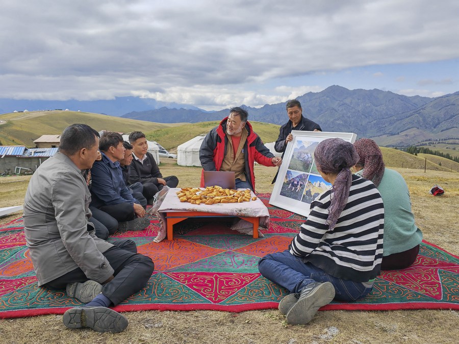 This photo taken on Aug. 13, 2023 with a mobile phone shows Tan Chengjun (C), a member of the Photojournalist Society of China, explaining photos to herdsmen in the pastoral area of Solbastao in northwest China's Xinjiang Uygur Autonomous Region. (Xinhua/Hu Huhu)