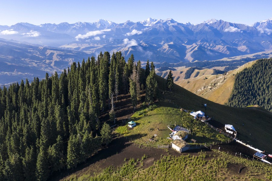 This aerial photo taken on Aug. 16, 2023 shows a view of the pastoral area of Solbastao in northwest China's Xinjiang Uygur Autonomous Region. (Xinhua/Hu Huhu)