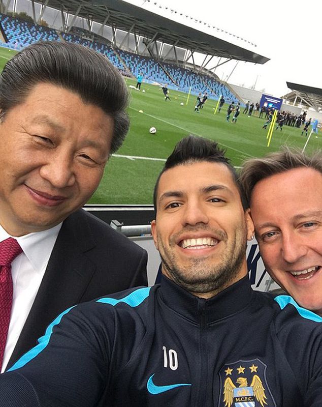 President Xi Jinping poses for a selfie with then-Prime Minister of the UK David Cameron and football player Sergio Aguero during his visit to Manchester City Football Club, Oct 23, 2015. [Photo/Manchester City FC Twitter account]