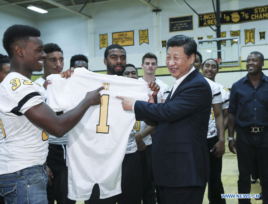 During his visit to the United States in September 2015, Xi was presented with a football and a personalized jersey bearing his name and "No 1" on the back at Lincoln High School in Tacoma, Washington. In return, Xi gifted them items including a ping-pong table.