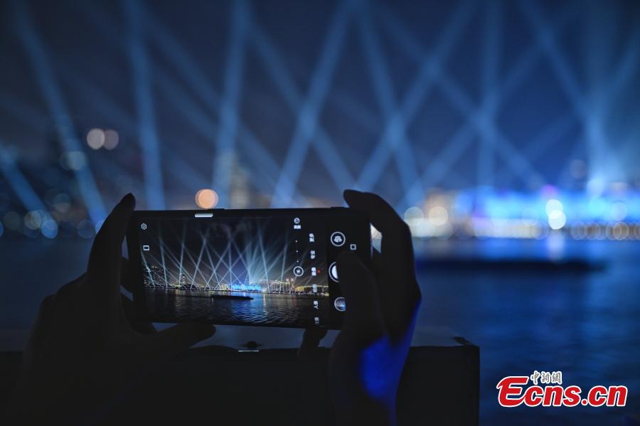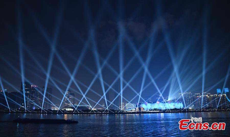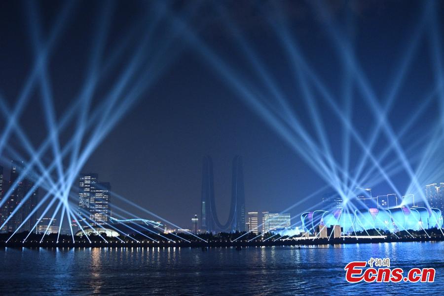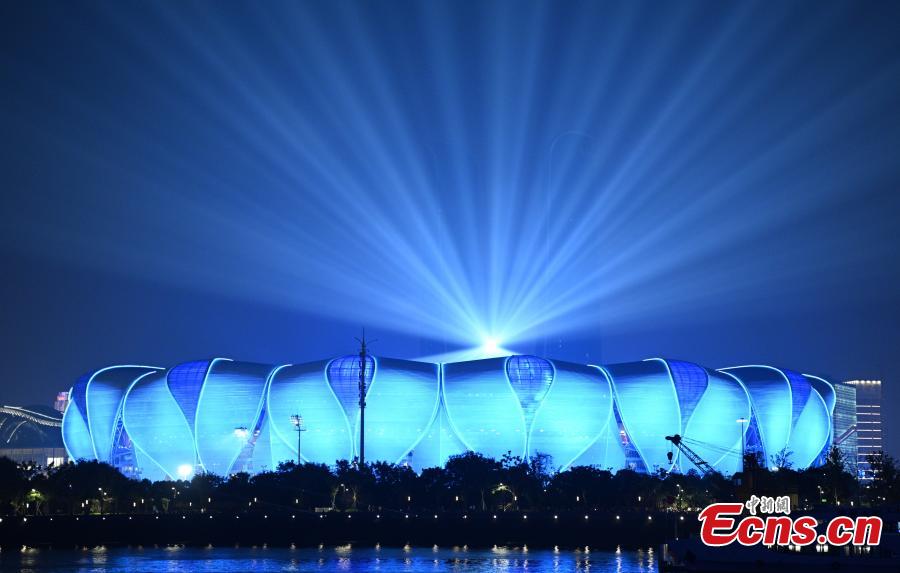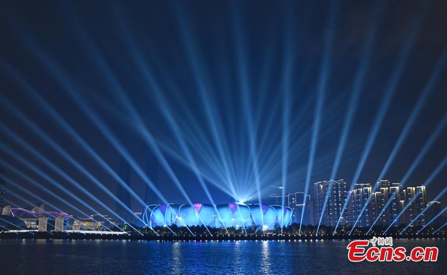 The Hangzhou Olympic Sports Center Stadium, nicknamed "the Big Lotus" and the main stadium for Hangzhou Asian Games, is illuminated during a rehearsal for the opening ceremony of the 19th Asian Games in east China's Zhejiang Province, Sept. 18, 2023. (Photo: China News Service/Wang Gang)