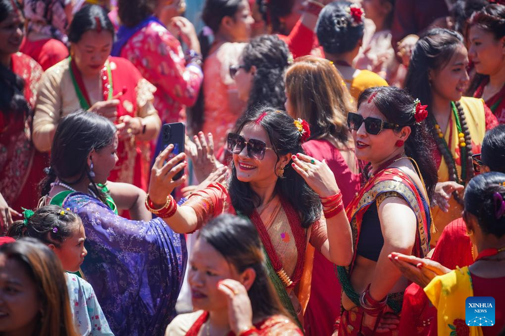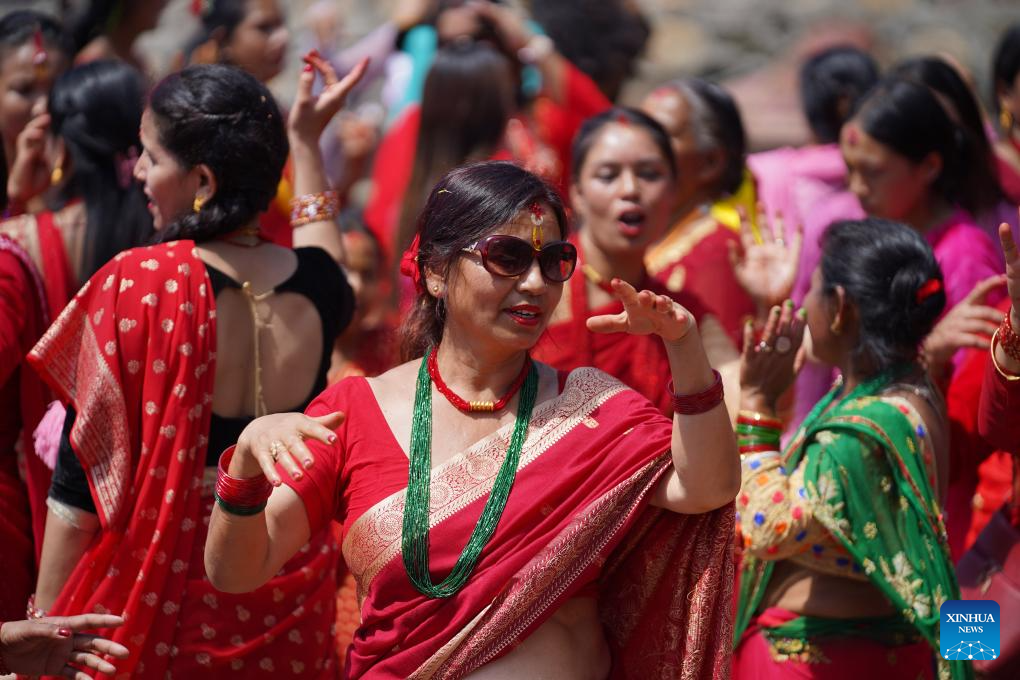 Women celebrate the Teej Festival in Kathmandu, Nepal, Sept. 18, 2023. (Photo by Sulav Shrestha/Xinhua)
